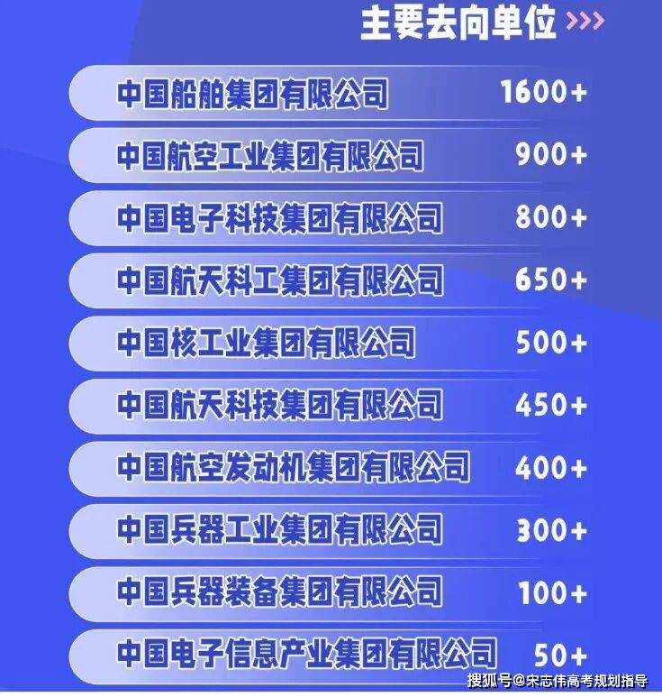 43+%,投身工业化、消息化和国防现代化扶植范畴就业比例为75+%,结业生签约世界500强及中国500强企业就业比例为47+%。近5年去往国防科技工业范畴就业9221人,次要去向单元如下:图片截自工程大学官微