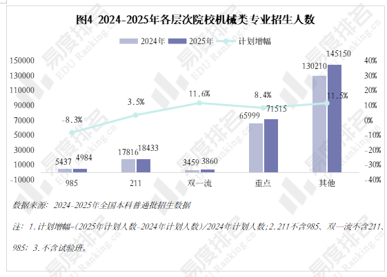 985院校机械类招生人数波动式下降,本年达到五年来最低,较2024年缩减8。3%,其他各条理院校则有3%-12%的涨幅,以更大的体量支持机械类招生总规模的抬升。近年,985院校缩减机械类专业招生规模已是常态,2021-2023年“三连降”,2024年急速回升,本年又起头下滑,华中科技大学、大连理工大学较客岁降幅达28%、23%。虽说机械类专业有所回温,但并非大热专业,尚处于新老专业更替期间,保守专业仍是招生从力,这就导致部门院校正在招生策略调整时将更多比例投放至市场需求度更高的专业,以“机械五虎”之一华中科技大学为例,2025年机械类招生打算较上一年降幅高居各专业类第一,电子消息类专业则扩招最多。